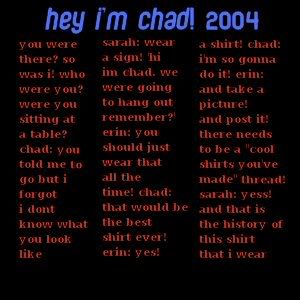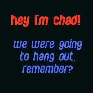 so, chad will be the creepy guy hanging around creepily, wearing the "hey i'm chad! we were going to hang out, remember" t-shirt. ![]() _________________ Facebook & Twitter & Blog(ish)-type thing |